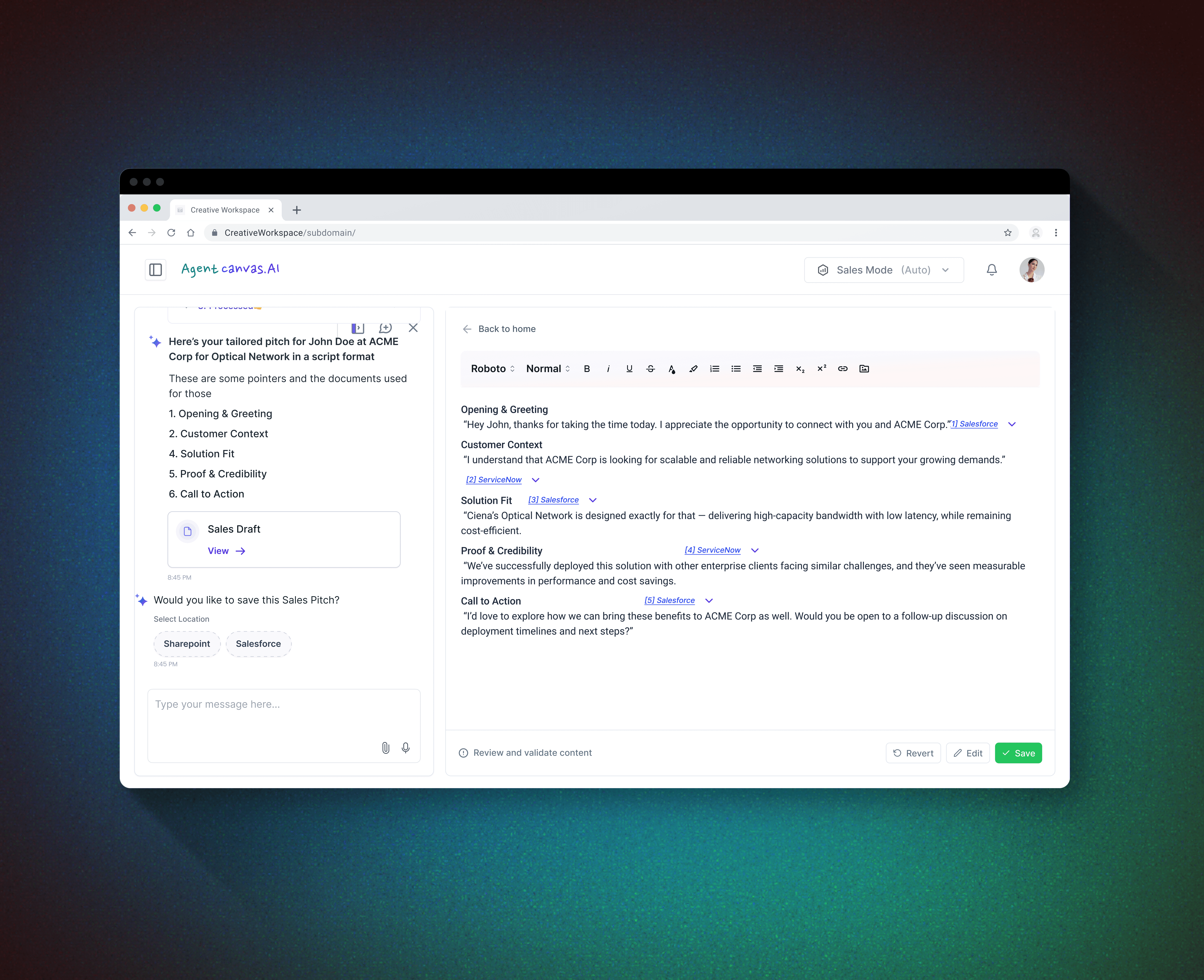 AgentCanvas transformed fragmented workflows into a single chat-to-canvas system that delivers $1M+ design-influenced revenue, enables ~72% faster code-to-execution, and shortens project cycles by 30–40% through governed, mode-based execution.